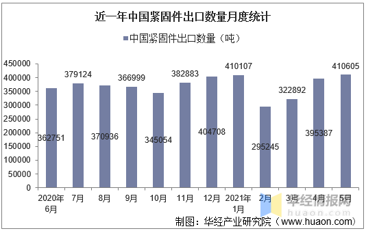 2021年1-5月中國緊固件出口數量為1833645噸,相比2020年同期增長了375232噸,同比增長25.8%;出口金額為3994329千美元,相比2020年同期增長了940589千美元,同比增長31%。