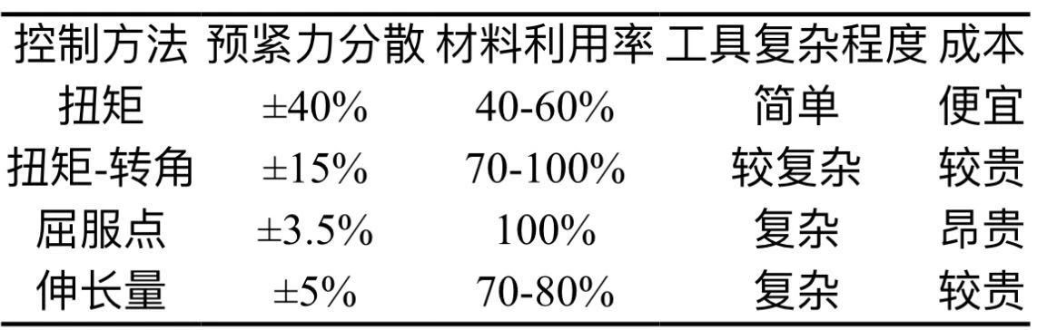 綜上,可以對上述介紹的的四種緊固控制方法進行簡單比較,其結果如下表所示。對比分析其優劣可見,在精度和成本之間,扭矩-轉角控制法處于一個較好的平衡點。