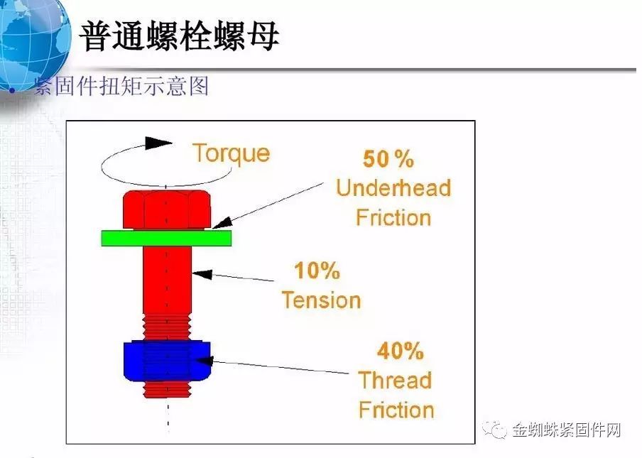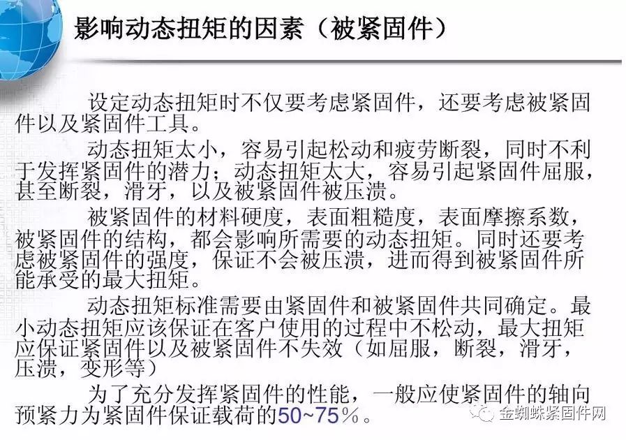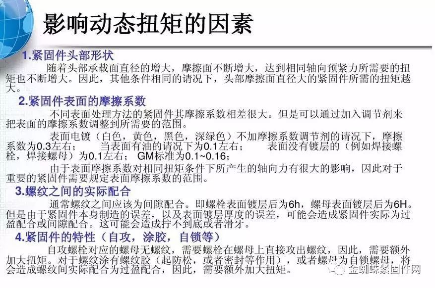 其中包括:螺栓的材質,螺栓的成型工藝,螺紋形狀,螺栓的同心性,螺紋連接副和墊圈的硬度,墊圈的類型和種類,部件的表面粗糙度,內螺紋邊緣的毛刺,螺栓鍍層的厚度、種類和一致性,螺栓的潤滑,螺栓的緊固工具,螺栓的擰緊速度,扭矩扳手和螺栓的配合度,螺栓的使用次數,環境溫度等。