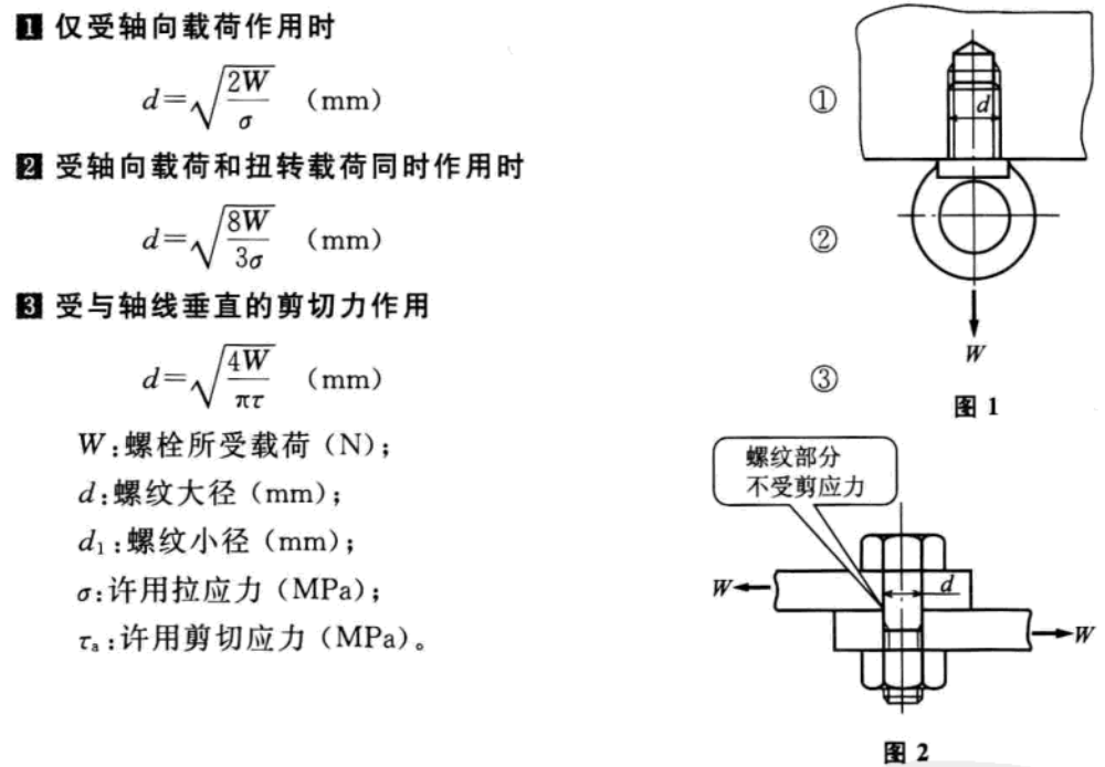 三角形螺紋適合做連接螺紋使用,方螺紋適合做受較大載荷作用的傳動(dòng)螺紋使用。螺栓受剪切力作用時(shí),螺紋部分所受的剪切力作用在螺紋小徑上。計(jì)算時(shí),螺紋的小徑d1可按0.8倍的螺紋大徑d計(jì)算,即d1=0.8d。