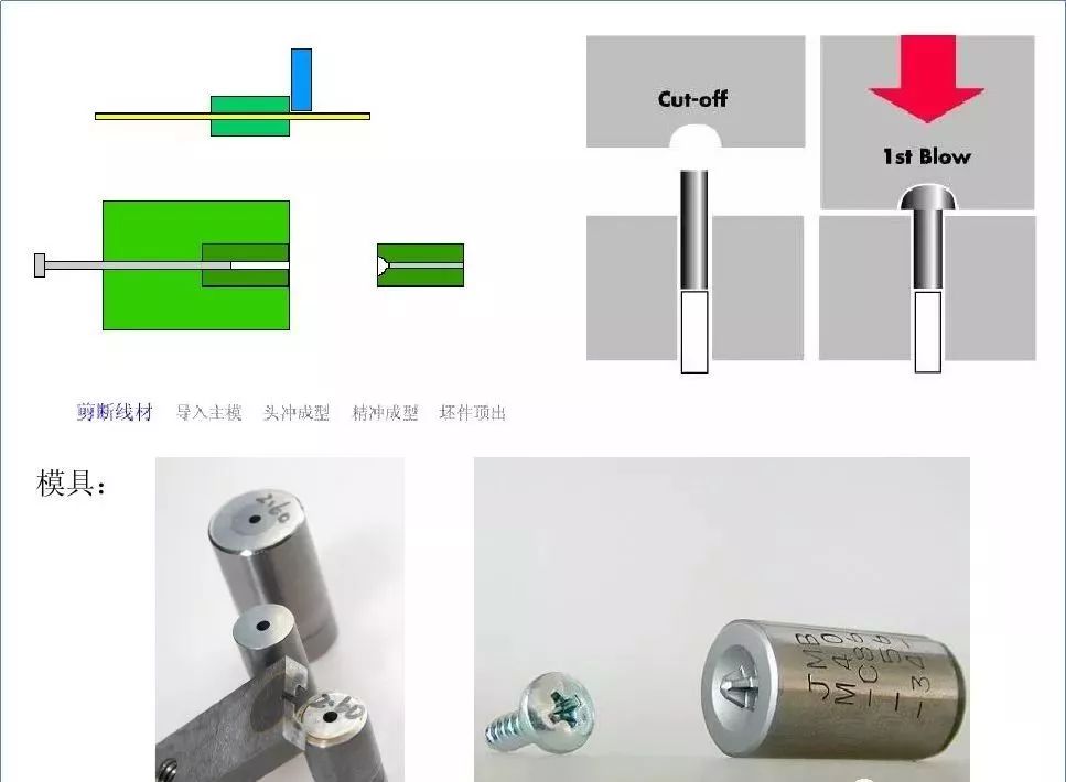 通過模具之間的相互作用,使之成型,先將線材切斷,鐓成螺絲坯件,形成頭部,十字槽(或其它頭型) 螺紋坯徑及桿長,頭下圓角等。