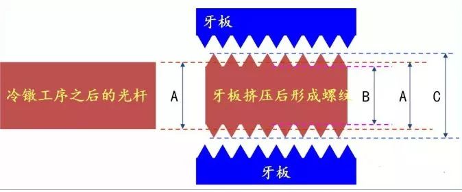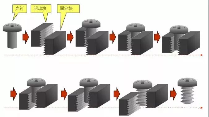 將冷鐓好的坯件搓出螺紋,通過活動牙板與固定牙板的相互作用,使之牙紋成型。