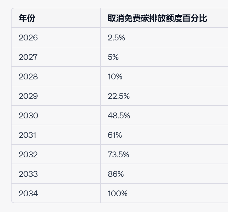 CBAM將從2026年開始逐步實施,直至2034年。其推進速度將與歐盟排放交易系統中免費配額逐步取消的速度保持一致。