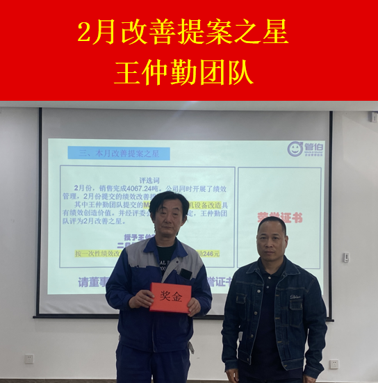 本次會議公布了2月份公司績效完成情況、副總級&經理級&主管級人員的績效得分、2月份績效改善提案情況。經評定,王仲勤團隊評為“2月改善提案之星”。