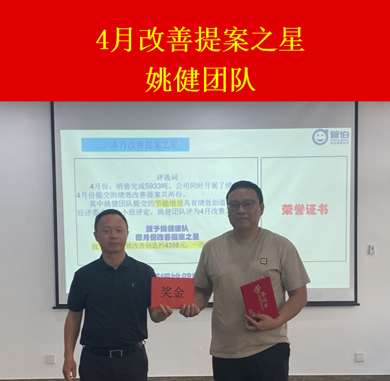 本次會議公布了4月份公司績效完成情況、副總級&經理級&主管級人員的績效得分、4月份績效改善提案情況。經評定,姚健團隊評為“4月改善提案之星”。