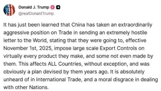 美國當地時間2025年10月10日,總統特朗普在社交媒體Truth Social上再次威脅:從11月1日起,對中國產品征收100%關稅;并對所有關鍵軟件實施出口管制。