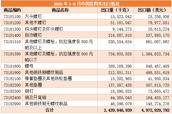 在出口方面,2025年1-6月中國鋼鐵制緊固件出口總量為2,439,846,939千克,與去年同期相比增長了14.1%;出口總金額為49.7億美元,同比增長9.3%。這一增長態勢表明中國緊固件在國際市場上的需求持續旺盛,產品競爭力不斷提升。