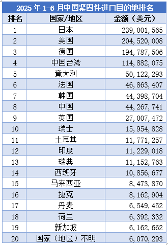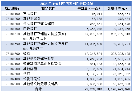 進口方面,2025年1-6月中國緊固件鋼鐵制進口總量為79,709,843千克,同比下降17.9%;進口總金額為11.3億美元,同比下降8.3%。進口量和金額的雙降,可能與國內緊固件企業技術提升、國產替代加速以及全球供應鏈調整等因素有關。